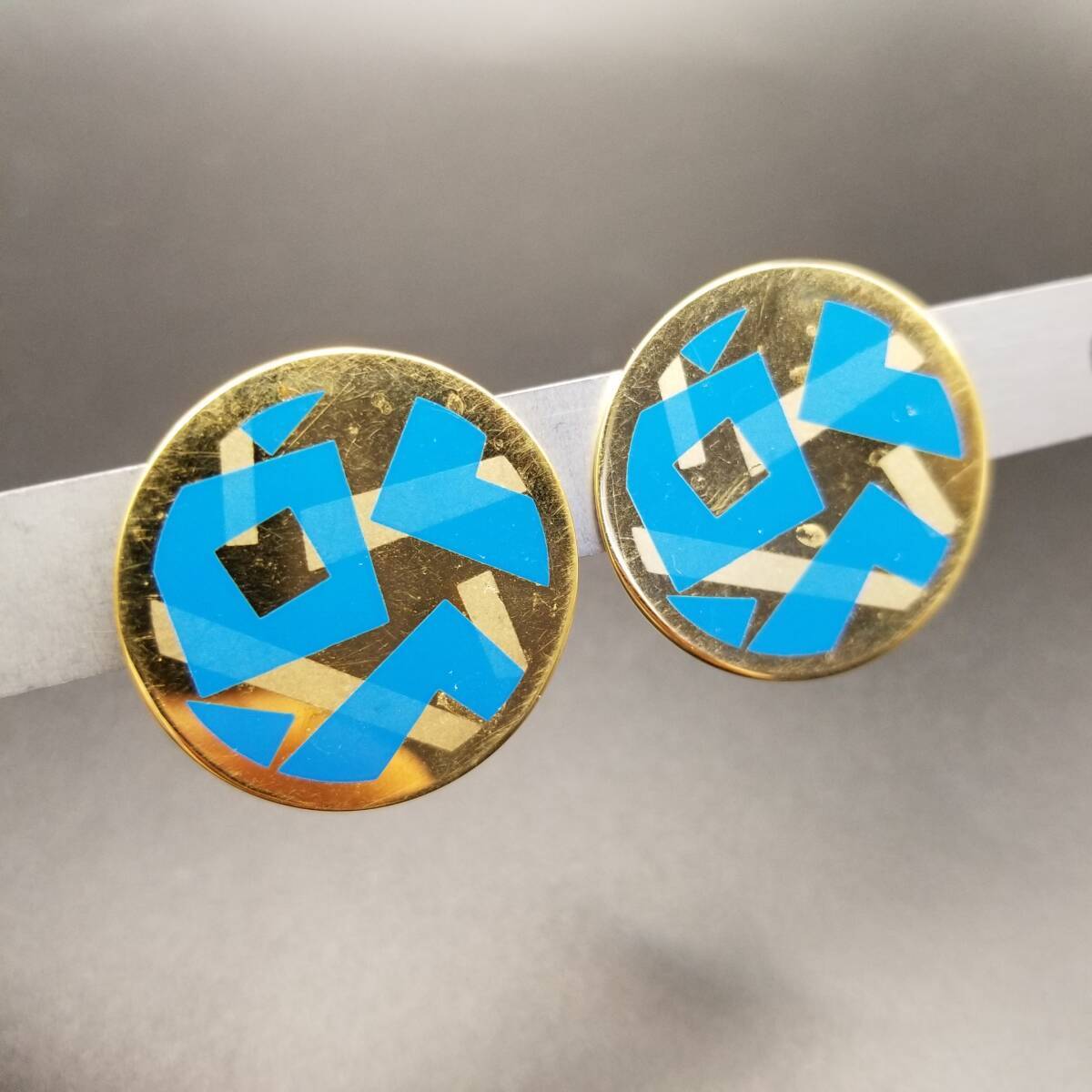 > AVON モザイク柄 ブルーライン ラウンドプレート ヴィンテージ クリップイヤリング ゴールドトーン 大ぶり 存在感 Y18-W