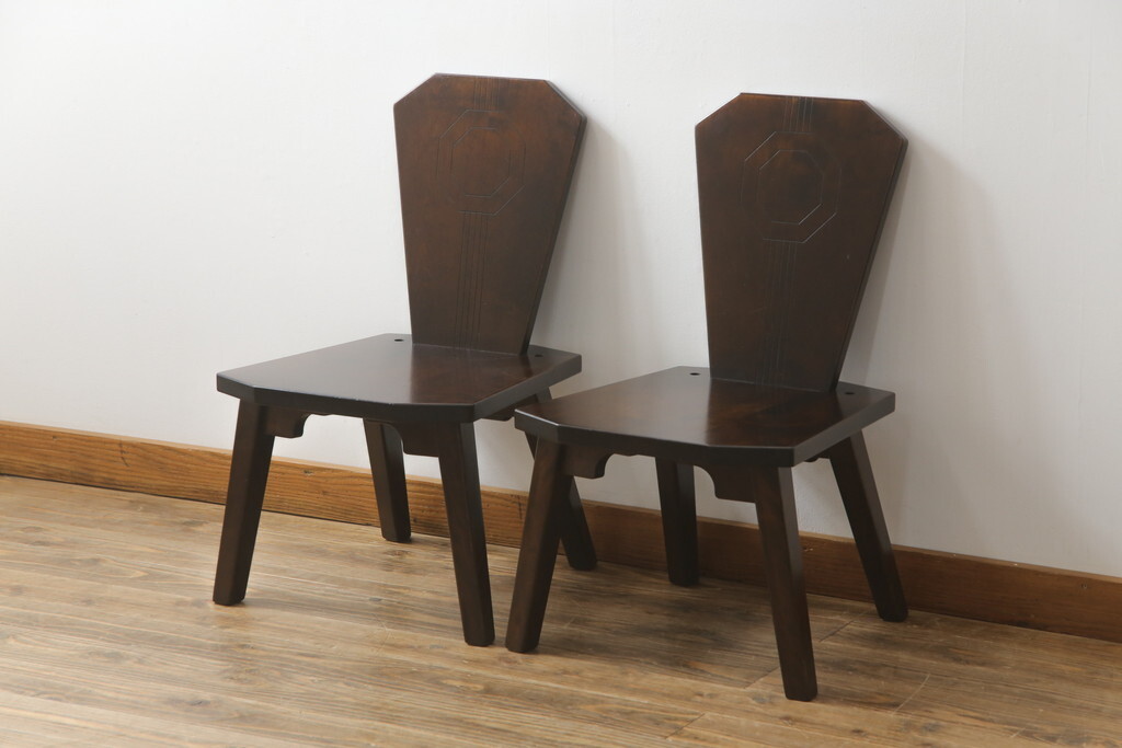 > R-077282 中古 廃盤モデル 星野民芸(星野民藝) 桜材 個性的なデザインが存在感を放つダイニングチェア2脚セット(板座チェア、椅子、イス)