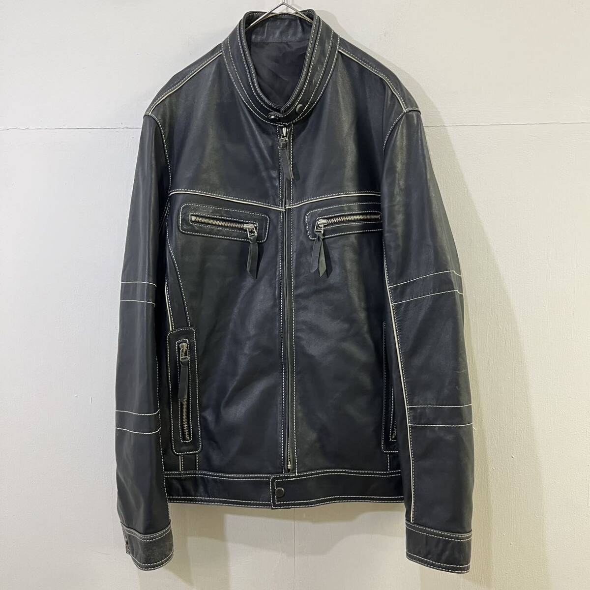 - VINTAGE chic LEATHER レザージャケット シングルライダース ライダースジャケット 羊革 ラムレザー ブルー 上質【送料一律/同梱可能】I