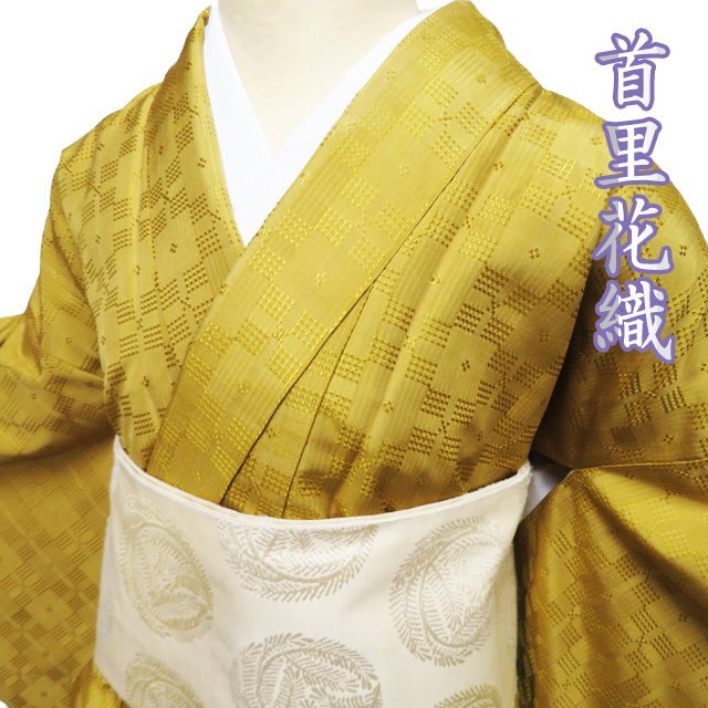 > 特選 琉球 首里花織 小紋 着物 中古 正絹 ラベル付き 小大丸扱い たとう紙付き 山吹茶 身丈159cm 裄66.5cm M きもの北條 A1084-4