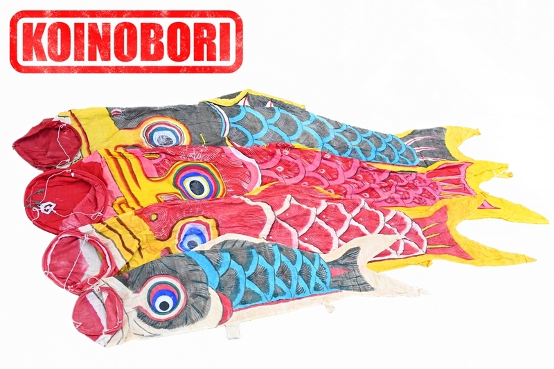 - 鯉のぼり 時代 鮮やか■木綿 古布 古裂 手描き 4匹 [ 3.5m 3.5m 3m 1.7m ] 4点■ 屋外 端午の節句 幟 子供の日 リメイク№K109■