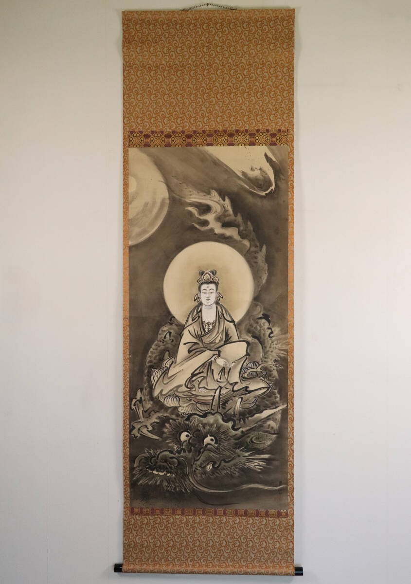- 【模写】日本画 仏画 龍頭観音像 紙本 掛け軸 月〇銘 桐箱 水墨画 MA72