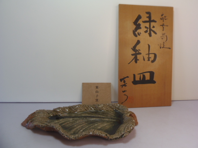 - s881 【能登島焼 案山子窯】 緑釉皿 葉形