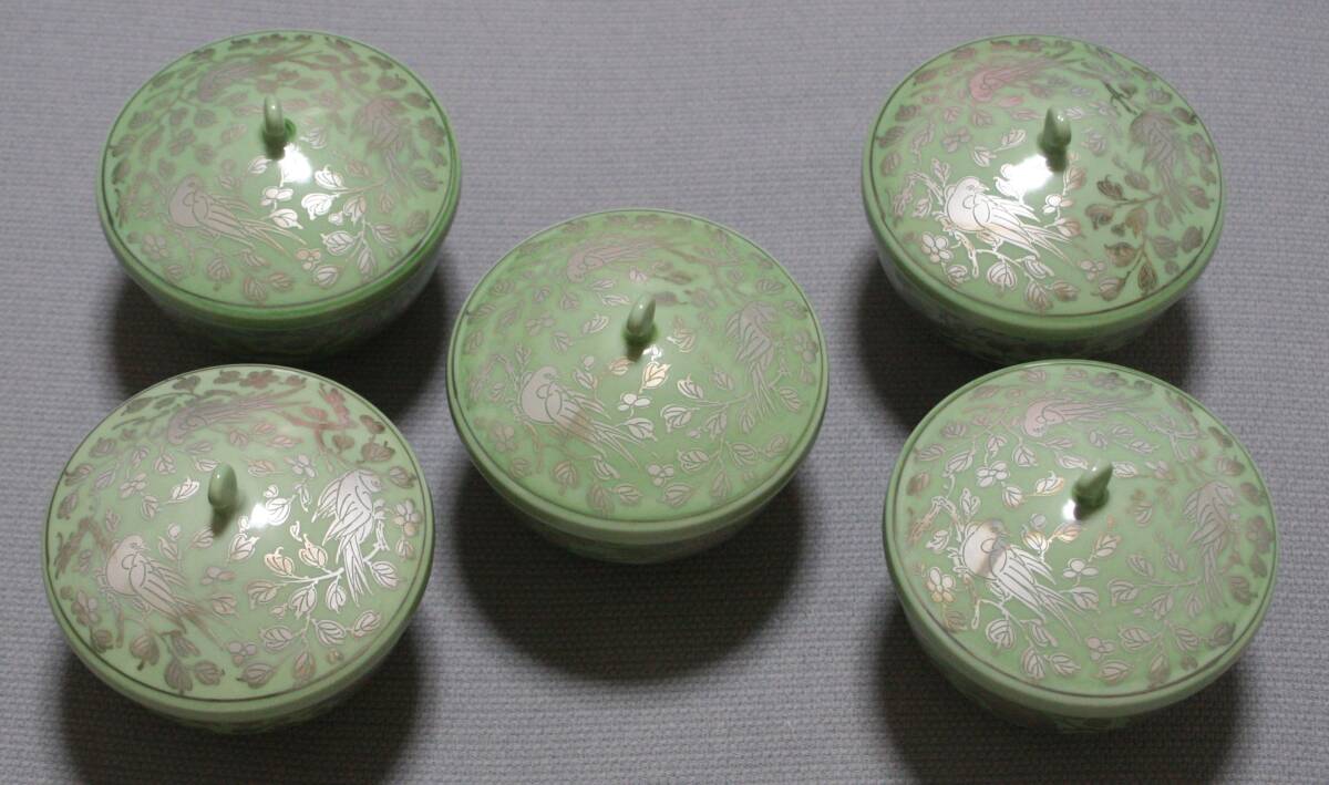 - ★龍峰 蓋付湯呑揃 5客セット 蓋付煎茶 湯のみ 萌黄銀彩 未使用 長期保管品★