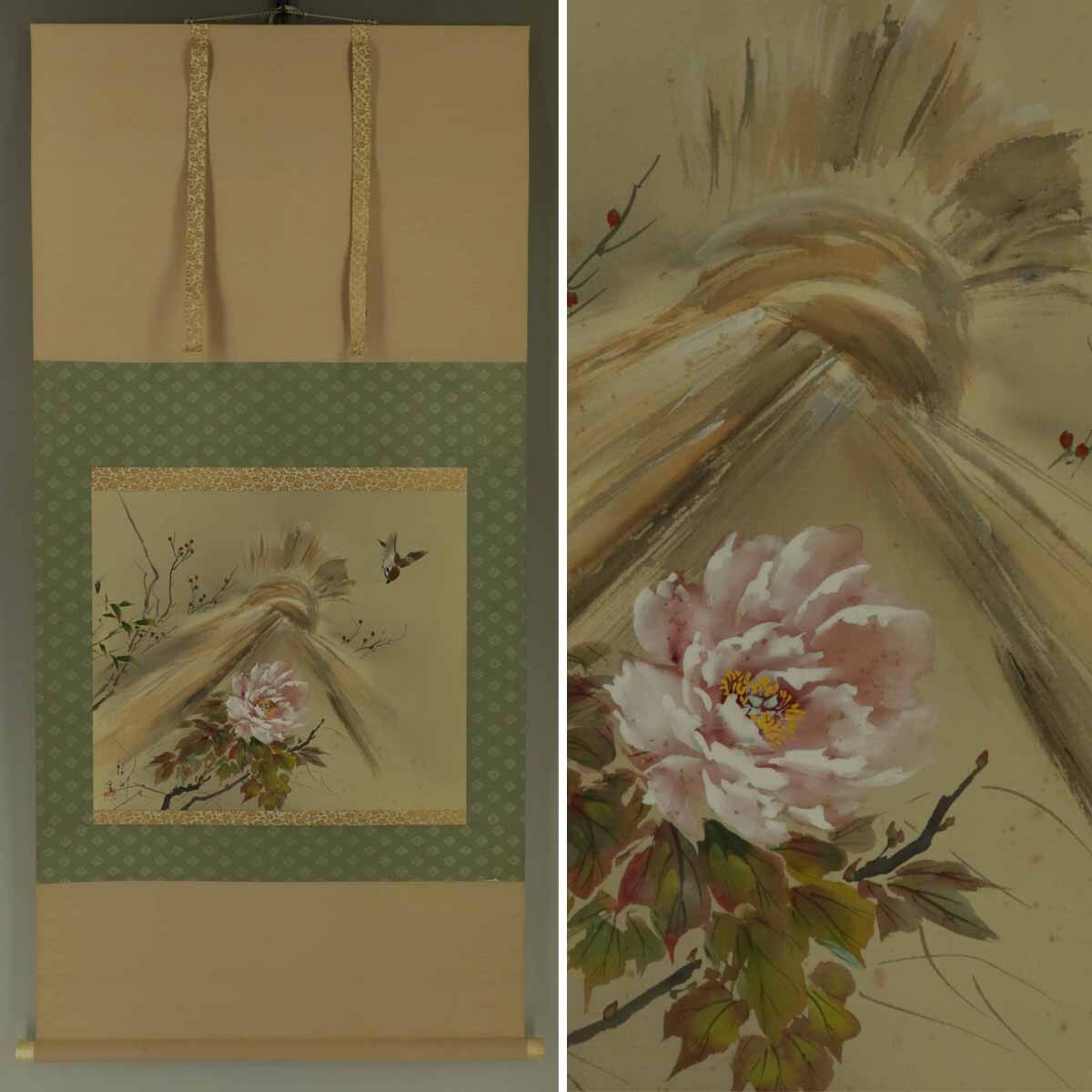 - 【模写】岡本緑邨【寒牡丹】◆絹本◆共箱◆掛軸 s01065b