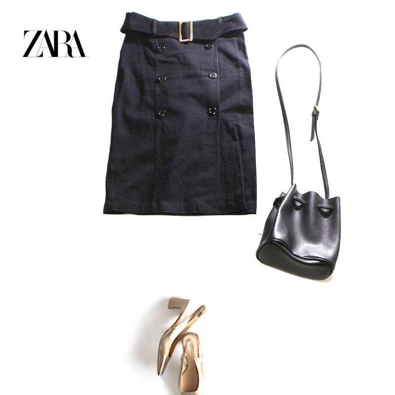 > 美品 ZARA BASIC ザラ ベーシック シンプル オールシーズン ベルト付き Wボタン コットン ミモレ丈 タイトスカート S XS ブラック 黒 US2
