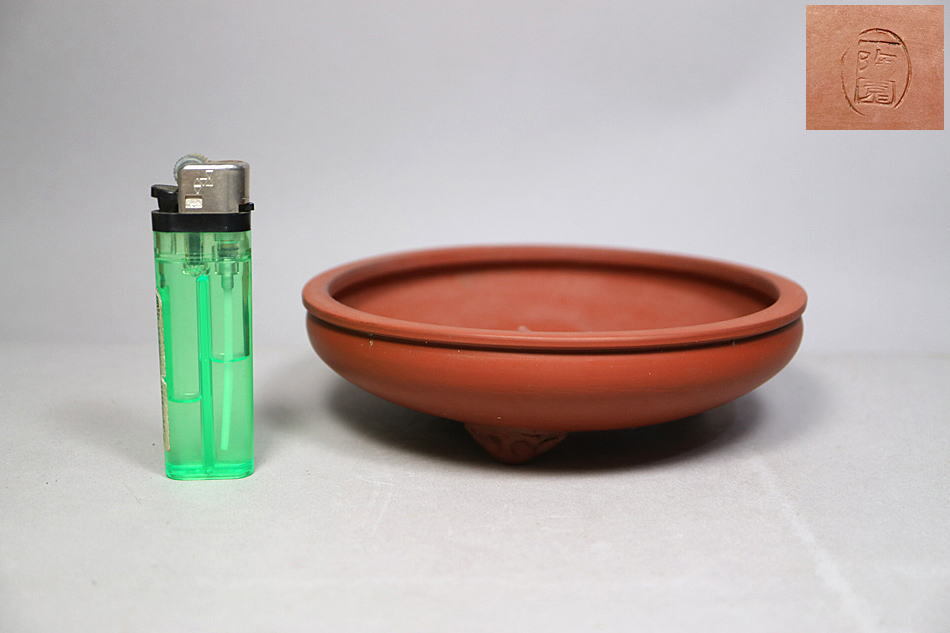 > b62) 小品 盆栽鉢「一陶園」在印・常滑焼・口経/約14.8cm 高さ/約4.2cm 三脚付丸鉢 小鉢<在銘 朱泥 緑泥 紫泥 烏泥 植木鉢 山野草鉢 蘭鉢