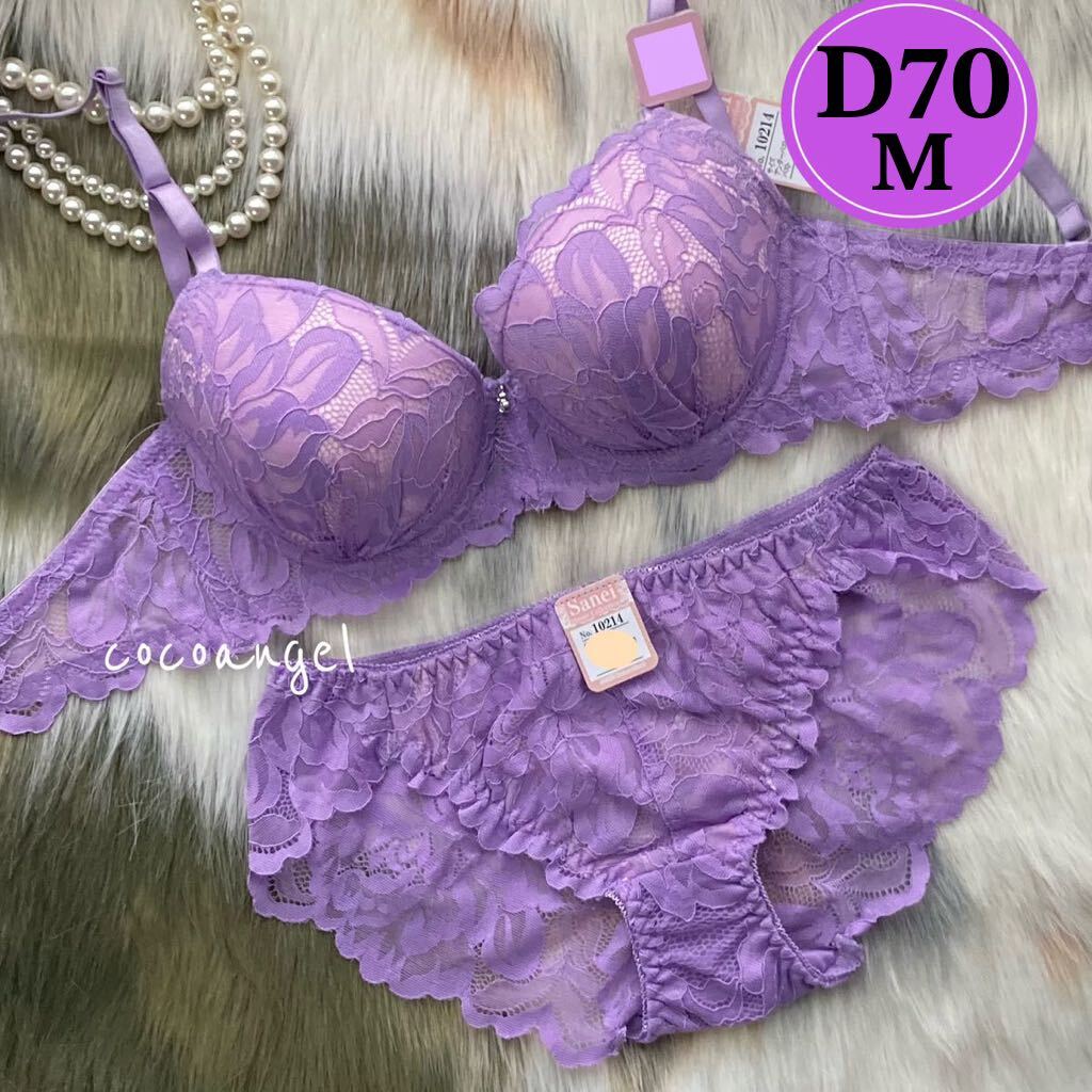 - 【D70M パープル 上下セット】新品 ブラ&ショーツセット ブラジャー ショーツ パッド内蔵 レース 透け ランジェリー グラマー Dカップ