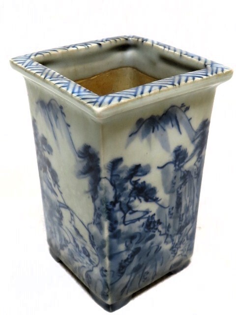 - 植木鉢 四方鉢 在銘 水山 染付山水図 小品盆栽鉢
