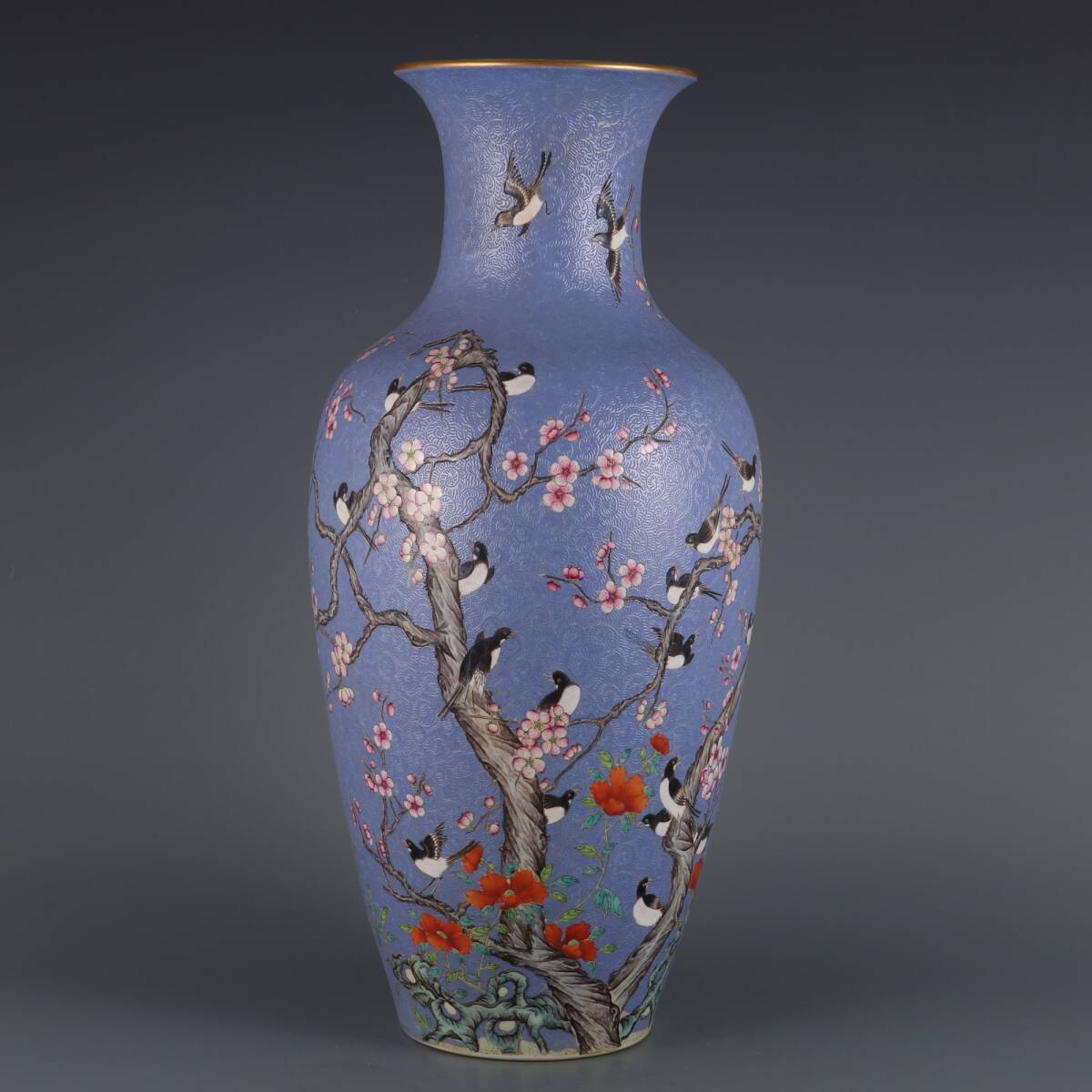 - 古陶磁 中国・清時代 乾隆年制 【藍地圧道粉彩喜上眉梢観音瓶】古賞物 古陶磁 古置物 古美術 唐物 LOT-92214
