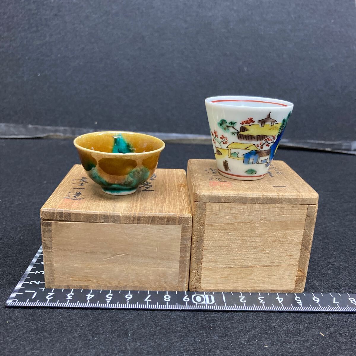 - 九谷焼き 越田基一作(物故作家) 酒器 山水紋盃、二彩盃 共箱付き 釉剥げ有り 二点組 アンテーク