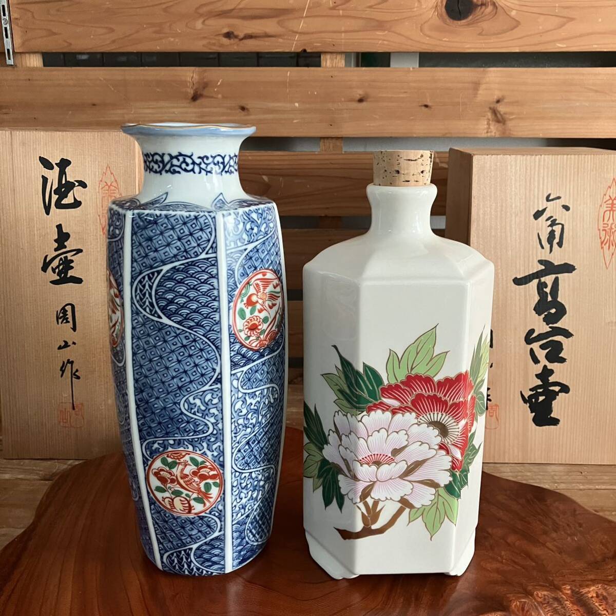- 木箱付き 六角酒壺 周山作 花瓶 陶器 オブジェ 空器 管S-59