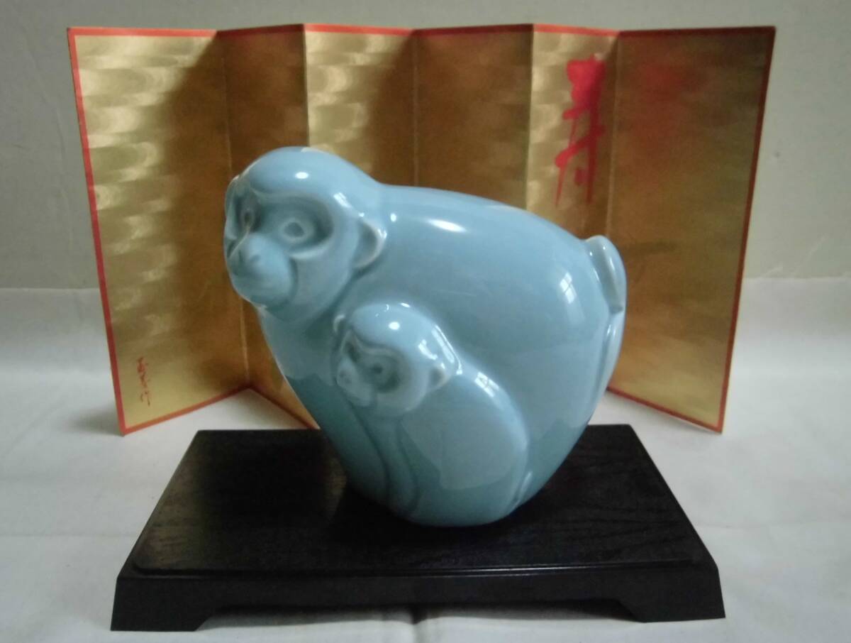 - 干支置物 申 青磁 親子 玉善作 飾り台 風付 猿 さる 陶人形 土人形 招福 開運 縁起物 飾り物 オブジェ工 芸品 レトロ
