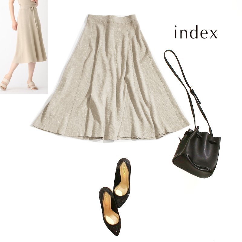 > 美品 index インデックス 株) ワールド ラメニットアップフレアスカート L シャンパンゴールド ラメニットスカート ミディ ミモレ丈 綺麗め