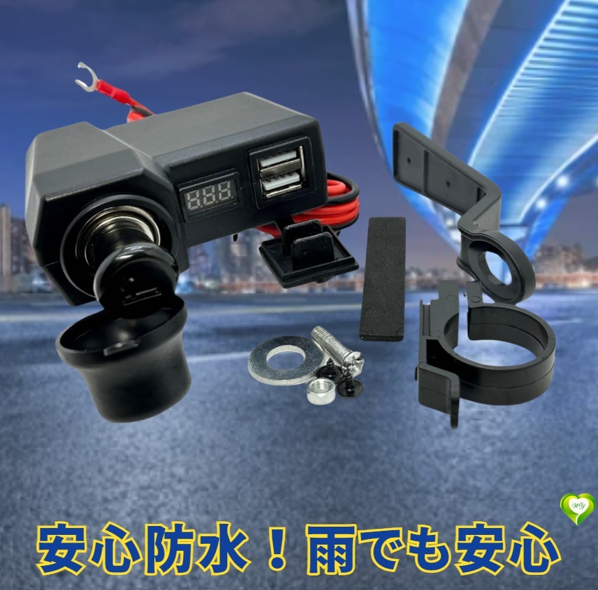 - 【安心防水!雨でも安心】バイク シガーソケット USB Type-A 充電器 2ポート シガーライター バッテリー電圧計付 電源 防塵 安心 高性能
