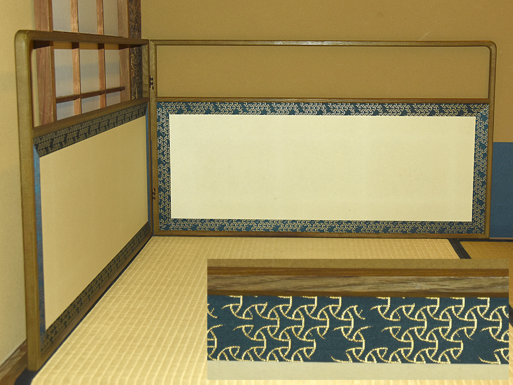 - 金銀箔独楽繋と銀砂子 風炉先屏風 両面使用 桑木地縁 片面94㎝×54㎝ 京間用 木工芸 茶道具 結界 屏風 z8291o