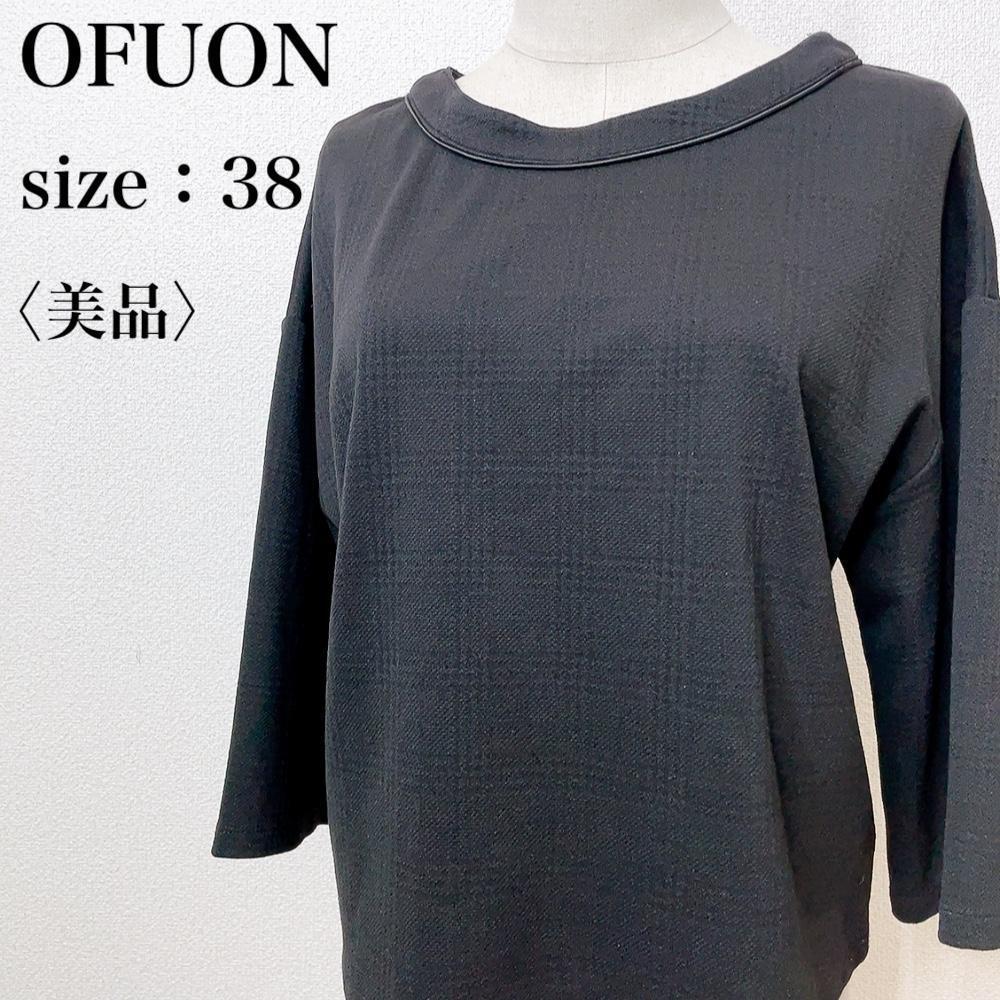 > 【美品】OFUON オフオン ゆったり 体型カバー チェック柄 黒 クルーネックカットソー ストレッチ 格子柄 ポリエステル ブラック み57