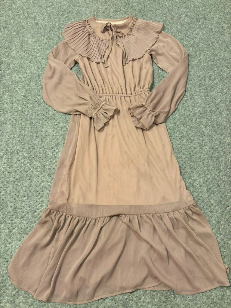 - 長袖プリーツフリル楊柳シフォンワンピース リボンチュニックロングフレアージャンパースカート グレイルGRLモーヴダスティピンク Sサイズ