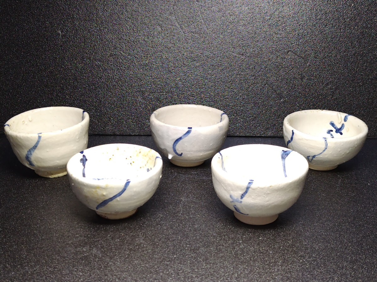 - A1742 未使用品 珍品 粘土工芸完成品 粘土工芸品 湯呑 ぐい呑 5点セット 茶道具 煎茶道具 酒器