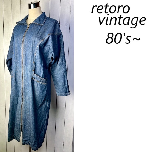- レトロ古着 80s~90s ジップ・スタッズデザイン ロング丈 デニムワンピース・コート M~L オールド ヴィンテージ レナウン 秋冬春 ★245