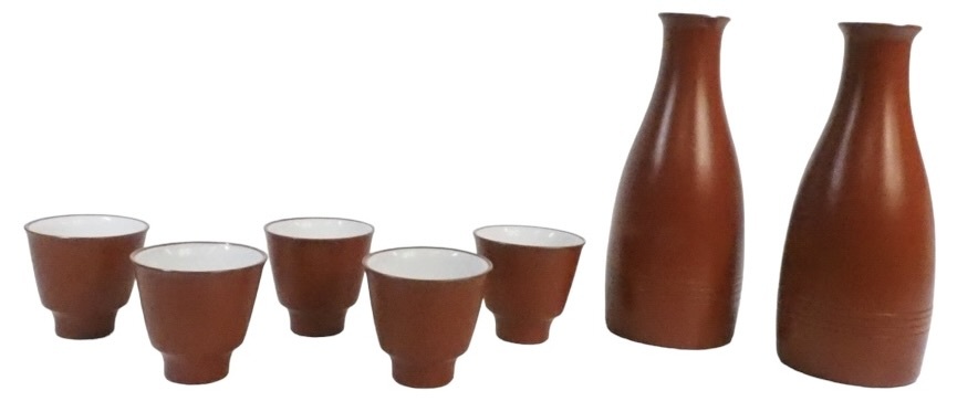- 昭和ビンテージ 「常滑焼 髙資陶苑製 朱泥 猪口 徳利 酒器7点セット 在銘品」1980年代 TAY610