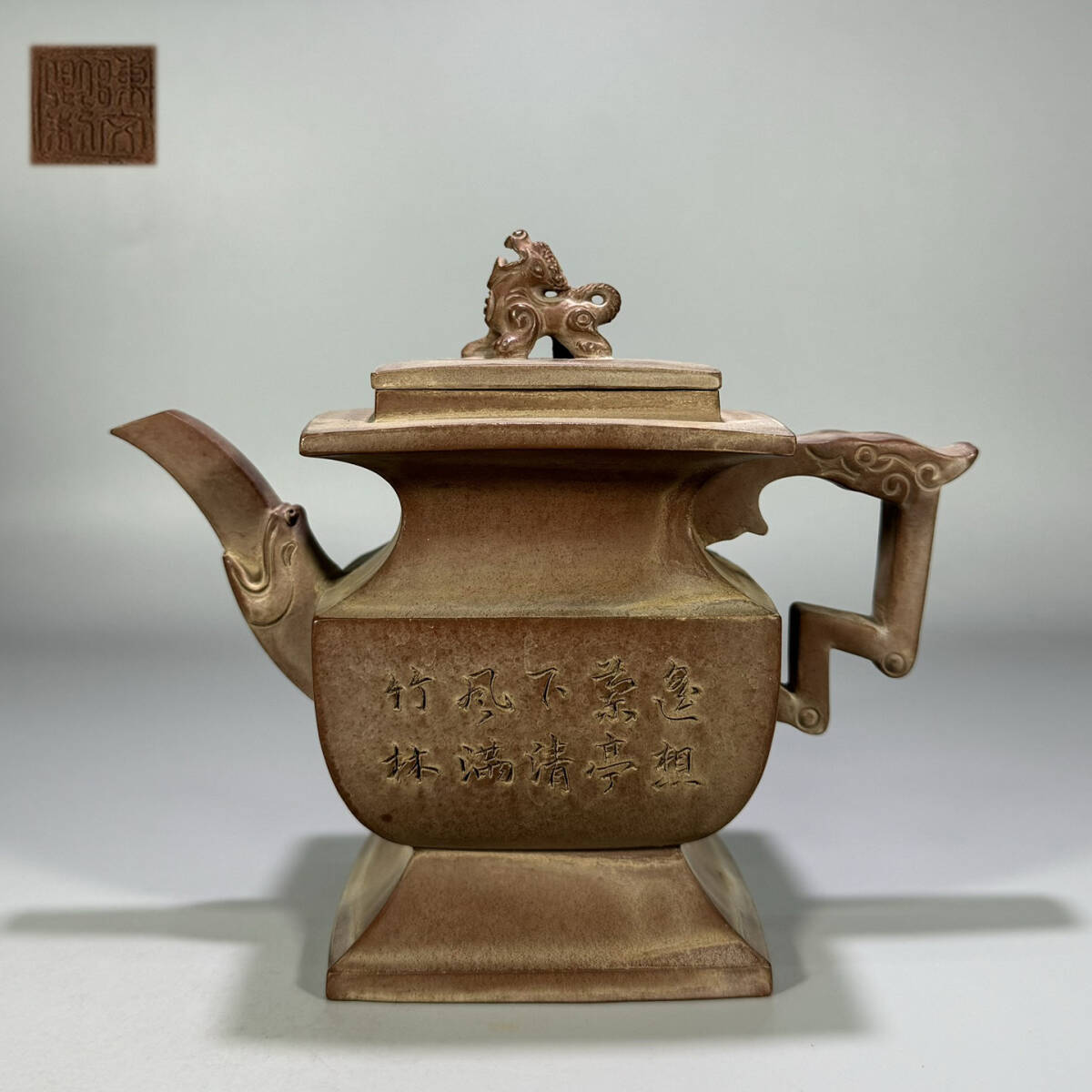 - 古陶芸 紫砂壷 清時代 【陳文卿】 製 「菱形四方竜尊壺」 段泥 煎茶 急須 茶道具 唐物 時代物 茶器 容量460cc LT-2409275