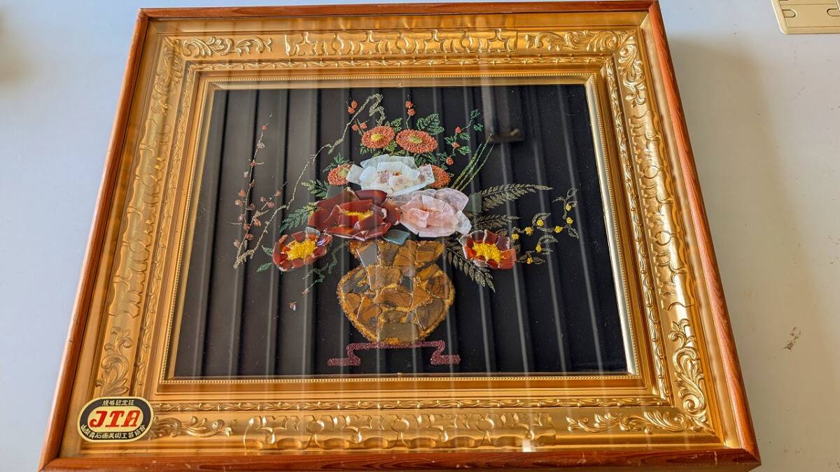 - ◆昭和レトロ◆アンティーク調木製額◆宝石画 貴石画 花瓶の花① ストーンアート 前面ガラス 山梨貴石画美術工芸協会 規格認定証