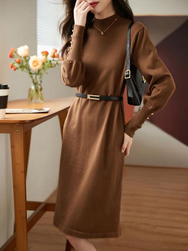 - 秋冬季 / 上品 大人 ニットワンピース ロングワンピース ドレス マキシワンピース 柔らか 膝丈 ミモレ丈 ニット ベルト きれいめ 長袖 /