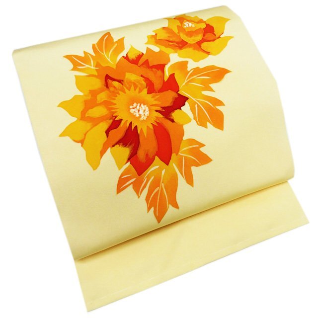 > 名古屋帯 なごや帯 中古 リサイクル 正絹 カジュアル 仕立て上がり 塩瀬 花の図 淡黄色 橙色 きもの北條 A1096-3