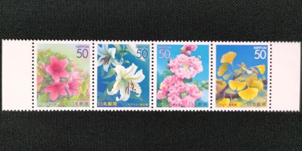 - [24102116] ふるさと切手【東京都・四季の花木Ⅲ】4種連刷 耳紙付「ツツジ サクユリ サルスベリ イチョウ」50円×4 2002年発行 美品