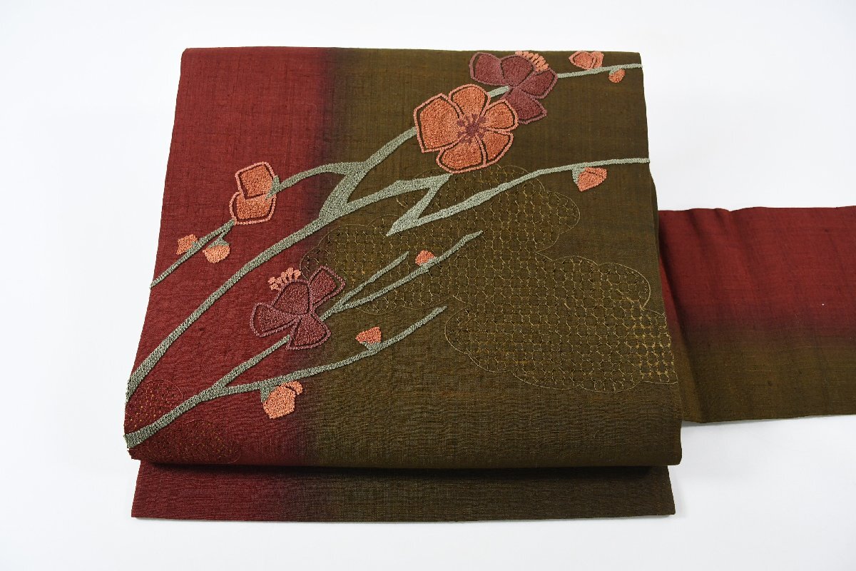- 名古屋帯 汕頭刺繍 中国刺 花 紬地 帯丈386cm ★着物屋 ne-13188 桜庭呉服店