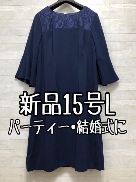 - 新品☆15号L紺系♪レース切替&フレア袖きれいワンピース〇p935