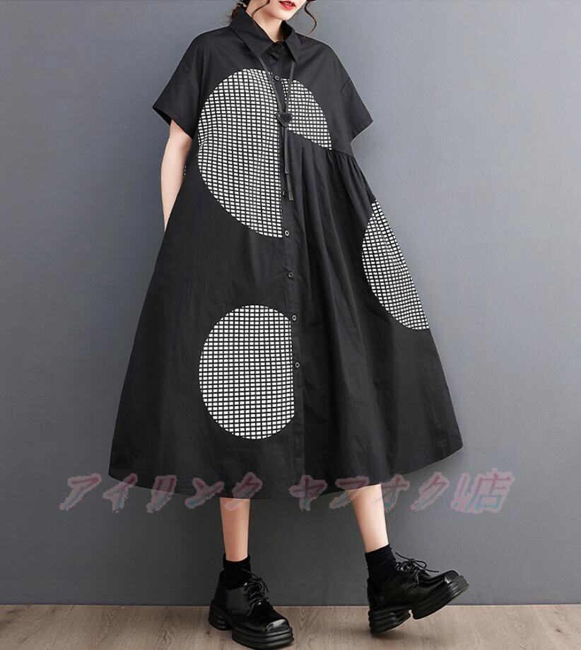 > ☆新品Fサイズ 夏 超綺麗 プリント 切り替え 半袖 ロングワンピース レディース 大きいサイズ シャツワンピース 黒