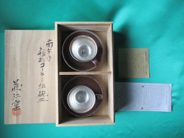 > 南蛮手 銀彩 コーヒー組碗皿 コーヒー カップ & ソーサー 2客セット 蔵珍窯 共箱 未使用品