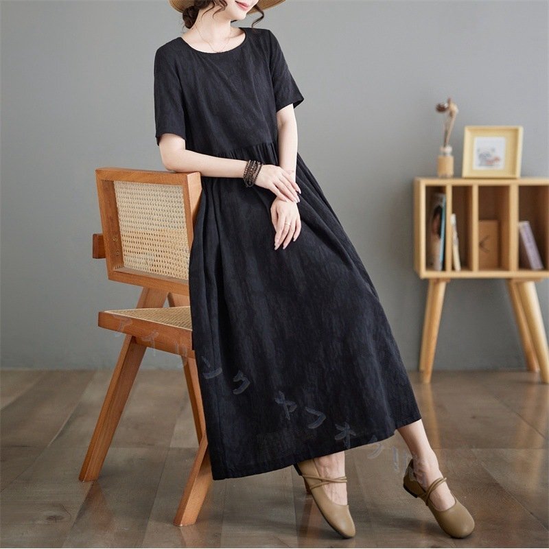 > ☆新品カジュアル ロングワンピース レディース マキシワンピース 半袖 ワンピース 綿麻 aライン ゆったり 着痩せ ブラック お色選択可