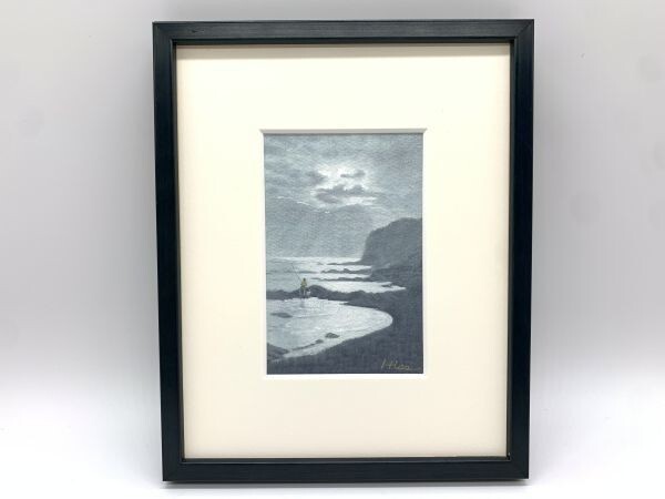 - 【真作】 水彩画 サイン:Hisa 『光芒と釣り人』 22×27 木製ガラス額 ※人の手で描かれたもの N0526B