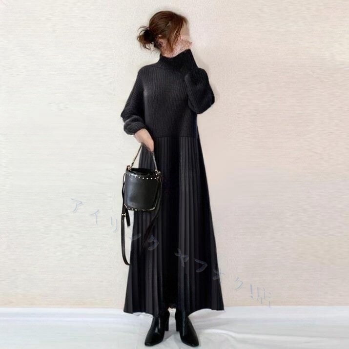 > ☆新品S-Lサイズ上質 ワンピース レディース ニットワンピース ニット切り替え きれいめ 長袖 ロングワンピースブラック サイズ選択可