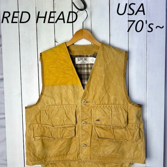 > USA古着 70s~80s USA製 RED HEAD 着脱ポケット ダックハンティングベスト L~XL 薄茶 オールド ヴィンテージ アメリカ レッドヘッド●84