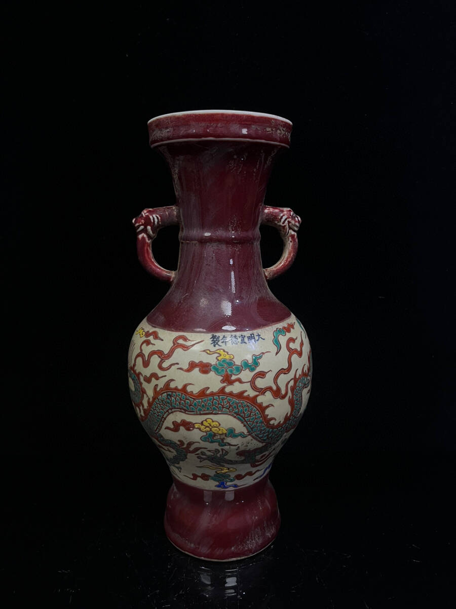 - 『明・宣德年製款・古陶瓷品・紅釉・五彩鳳紋・雙耳瓶』極細工 置物古賞物 中国古玩 中国古美術