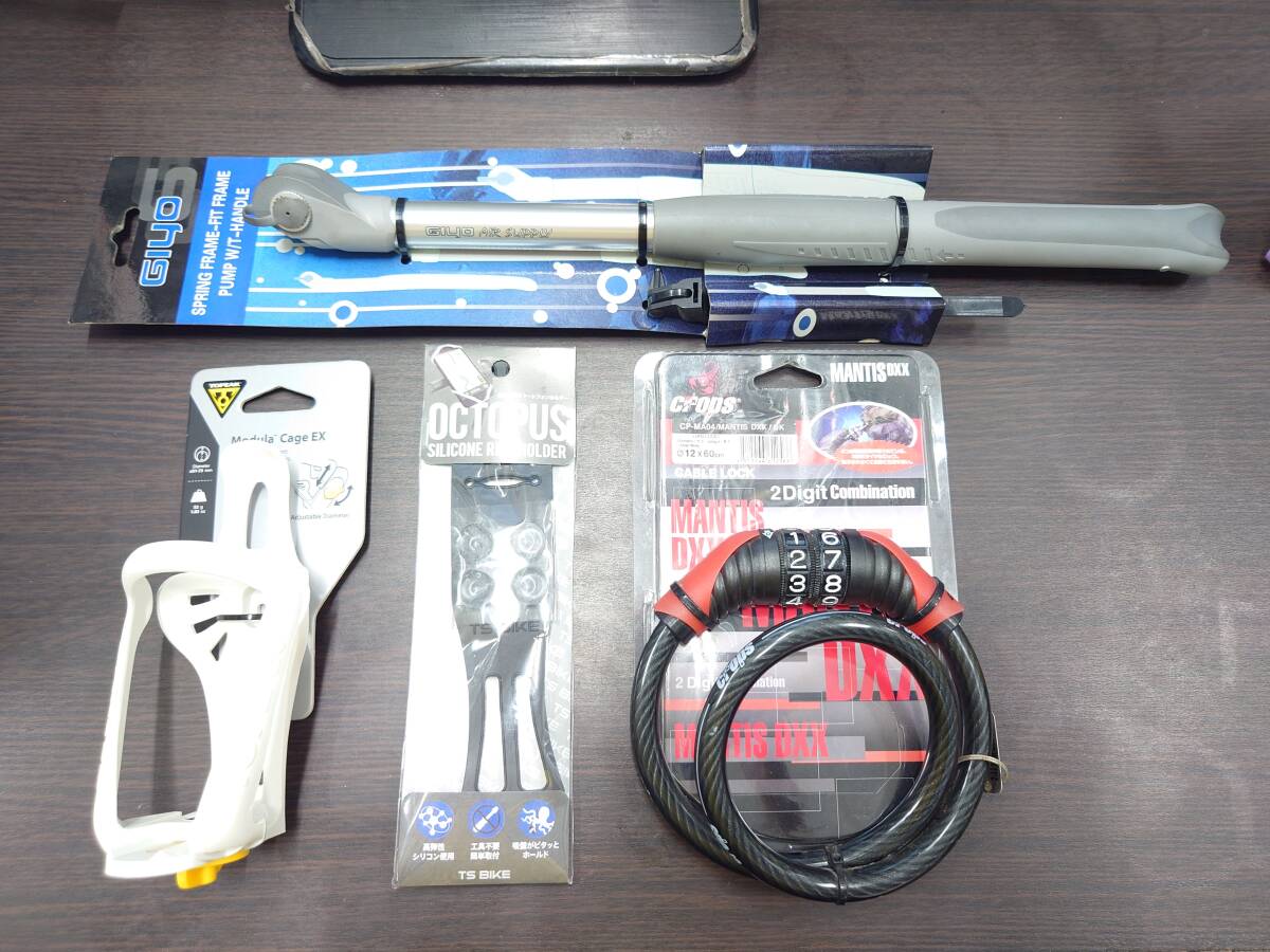 - 【新品・未使用品】自転車アクセサリー 携帯ポンプ ドリンクホルダー スマホホルダー ワイヤー錠 アソートセット