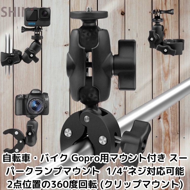> 自転車/バイク Gopro互換マウント付属 スーパークランプマウント 1/4”ネジ対応 2点位置の360度回転 (クリップマウント) カメラ固定に