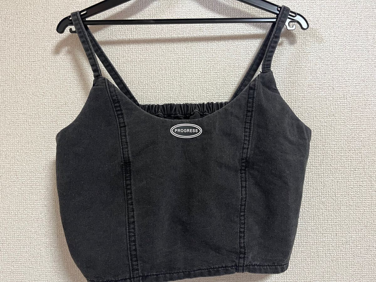 - DAZY デニムキャミトップ ダークグレー 刺繍入り文字アップリケ デニム生地