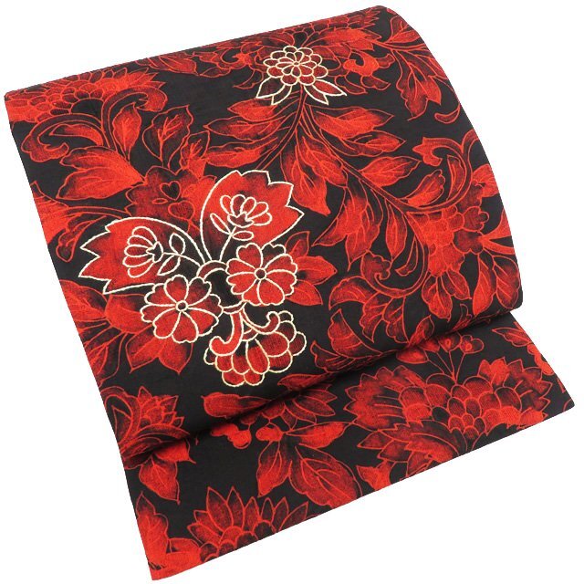 > 名古屋帯 なごや帯 中古 リサイクル 正絹 紬地 カジュアル 仕立て上がり 刺繍 花模様 黒色 緋色 きもの北條 A1109-11