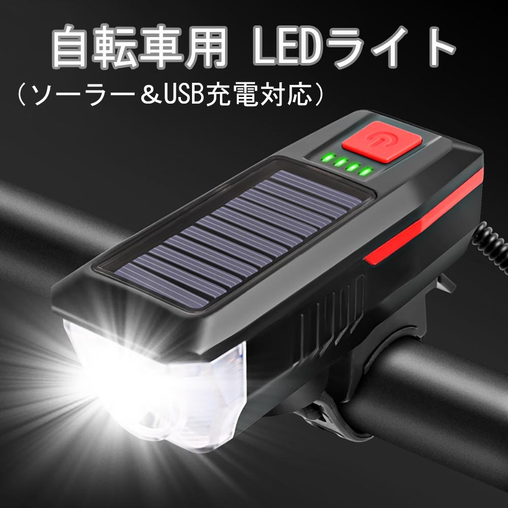 - 自転車 LED ヘッド ライト ソーラー USB 充電 ホーンブザー 防水 赤 黒 レッド ブラック LEDライト バイクライト フロントライト