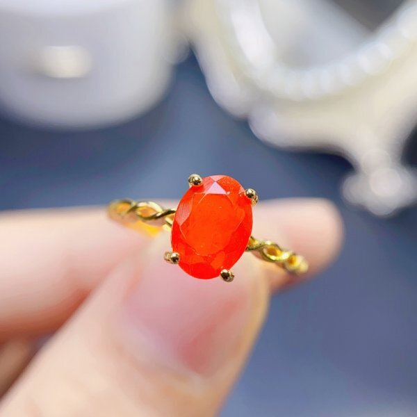 > 【証明書付き】天然火のオパールリング、6×8mm、女性用、925シルバー、サイズ調節可能、最初の入札者様は開始価格で購入可能