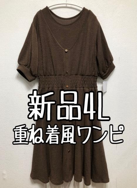 - 新品☆4L♪茶系♪金色パーツおしゃれ重ね着風ワンピース☆z345