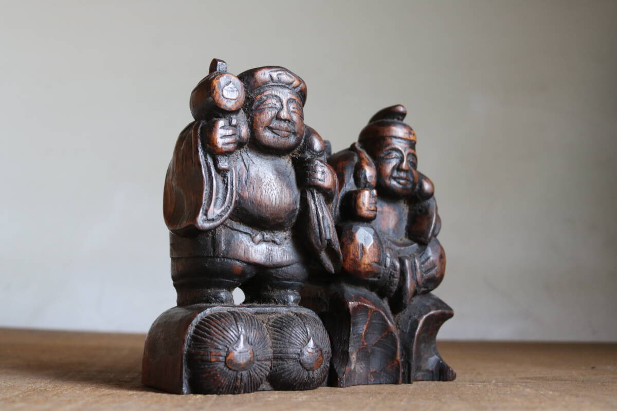 - 【伊董】B162.古民芸!味トロトロ!経年美化!古い木彫り恵比寿大黒セット欅 #ディスプレイ #恵比寿大黒 #古道具 #木彫り