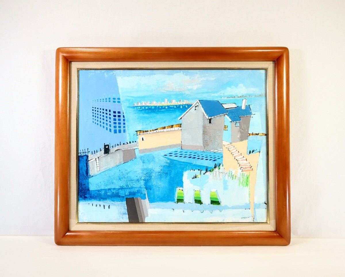 - 真作 南波靖造 2005年油彩「湾に街が生まれる K」画寸 F15 大阪府出身 一枚の絵取扱作家 爽やかな青空と透明感あるブルーが冴える港街 9954