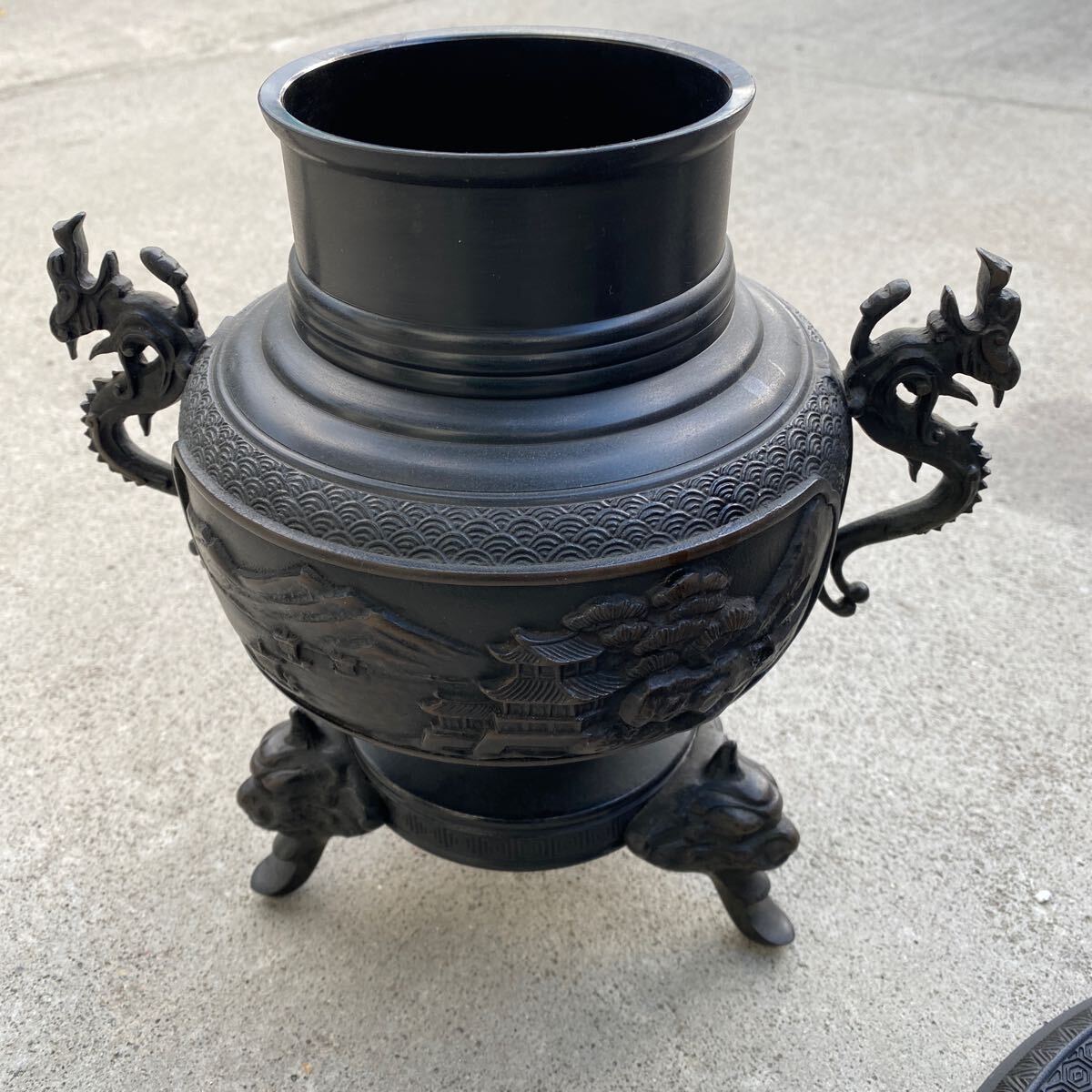- 福 双龍 浮雕 生け花 銅器 花器 華道具 茶道具 花入 華道 古道具 薄端