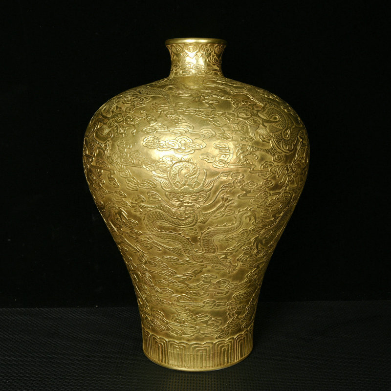 - ◆旧家蔵出◆古美術 中国古玩 大清乾隆年製款 金地 高浮雕 龍紋梅瓶 古賞物 骨董 時代物 T16